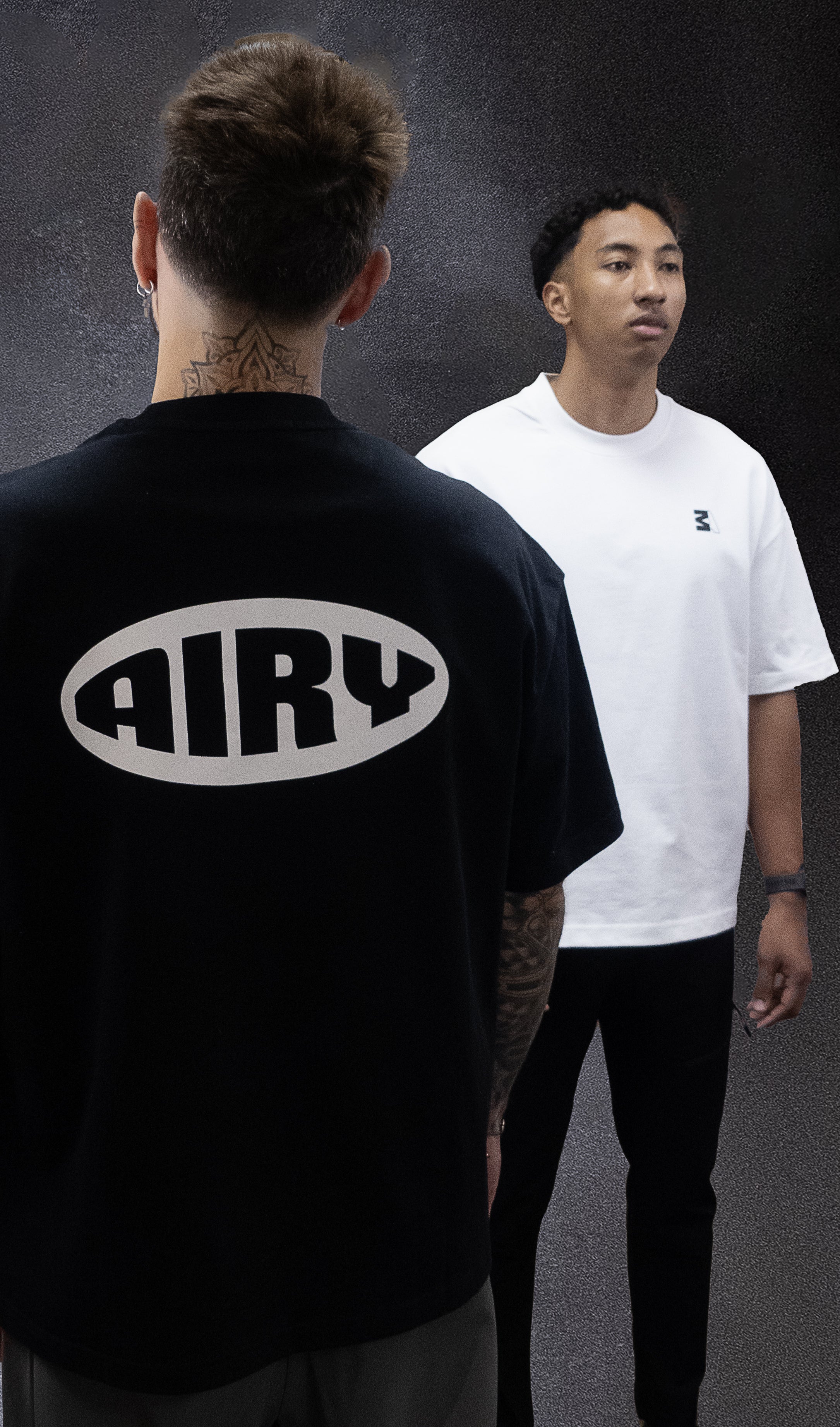 Le T-shirt AIRY Oversize est fabriqué à 100% en coton, garantissant un confort optimal. Brayan, mesure 1m80 et Thibaut, mesure 1m79, portent tous deux une taille M.